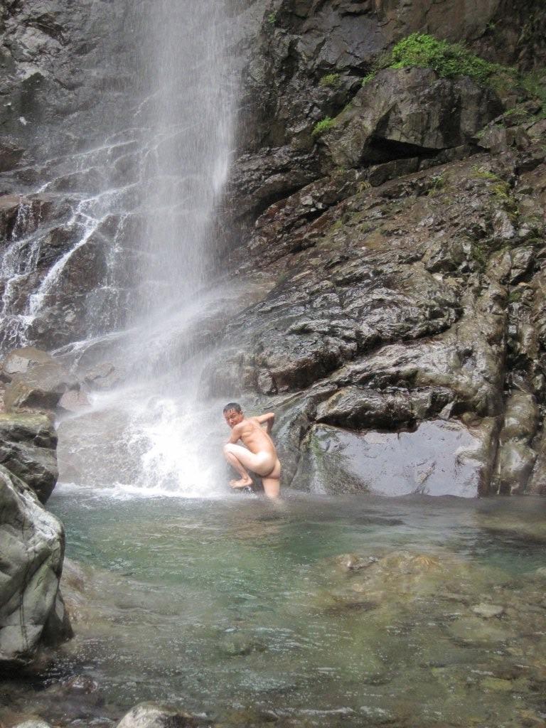 そして脱ぎながらNutZに説明しました。「滝に打たれながら岩をよじ登って、くまきりあさみみたいな格好を するので、その姿を写真におさめてほしい」と。服は単純に濡れるから脱いだ訳です。